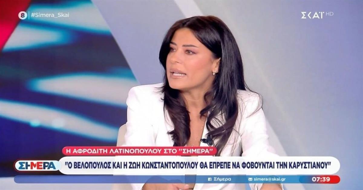 Η συζήτηση ξεκίνησε με το ενδεχόμενο καθόδου της Μαρίας Καρυστιανού στην πολιτική αρένα. Η Αφροδίτη Λατινοπούλου κράτησε αποστάσεις, σημειώνοντας πως «θα σχολιάσω την Καρυστιανού όταν κάνει κόμμα». Ωστόσο, έσπευσε να συμπληρώσει πως μια τέτοια κίνηση θα έπρεπε να προκαλεί ανησυχία σε συγκεκριμένους πολιτικούς χώρους, εκτιμώντας πως ο Κυριάκος Βελόπουλος και η Ζωή Κωνσταντοπούλου είναι εκείνοι που θα έπρεπε να «φοβούνται» την κ. Καρυστιανού.