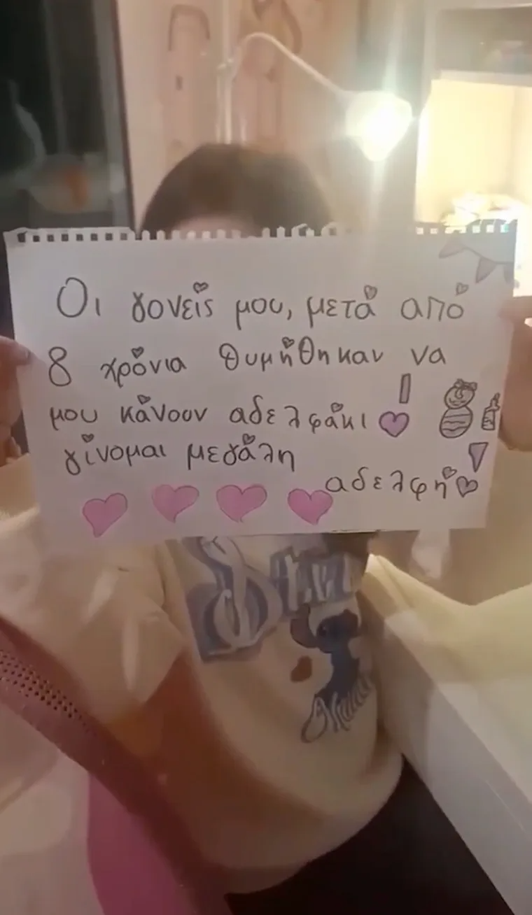 Η ευχάριστη είδηση έγινε γνωστή μέσα από το TikTok, όπου η τραγουδίστρια μοιράστηκε ένα τρυφερό βίντεο με πρωταγωνίστρια την 8χρονη κόρη τους. Στο απόσπασμα, το κοριτσάκι γράφει σε μια κάρτα: «Οι γονείς μου, μετά από 8 χρόνια θυμήθηκαν να μου κάνουν αδελφάκι! Γίνομαι μεγάλη αδελφή!», προκαλώντας συγκίνηση στους διαδικτυακούς της φίλους.