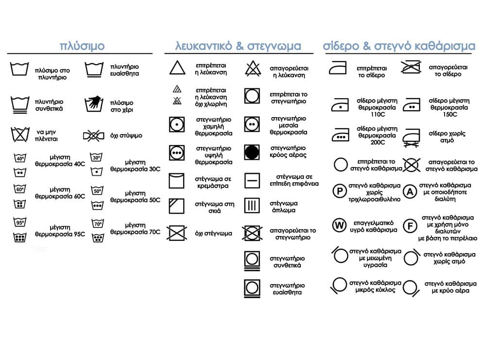 Κάποια σύμβολα, όπως ο κουβάς με το νερό και η αναγραφόμενη θερμοκρασία, είναι αρκετά ξεκάθαρα, καθώς δείχνουν τη μέγιστη θερμοκρασία στην οποία πρέπει να πλυθεί το ρούχο στο πλυντήριο.