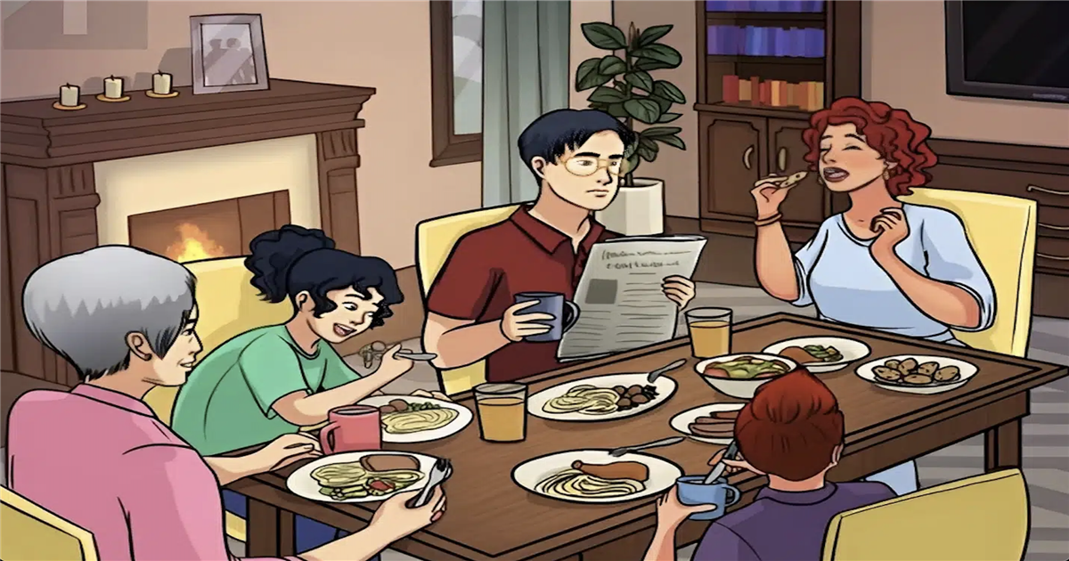 Στην παραπάνω εικόνα βλέπουμε μια οικογένεια να κάθεται στο τραπέζι και να τρώει. Αν και η εικόνα φαίνεται φυσιολογική και ασυνήθιστη, υπάρχει ένα λάθος σε αυτήν.